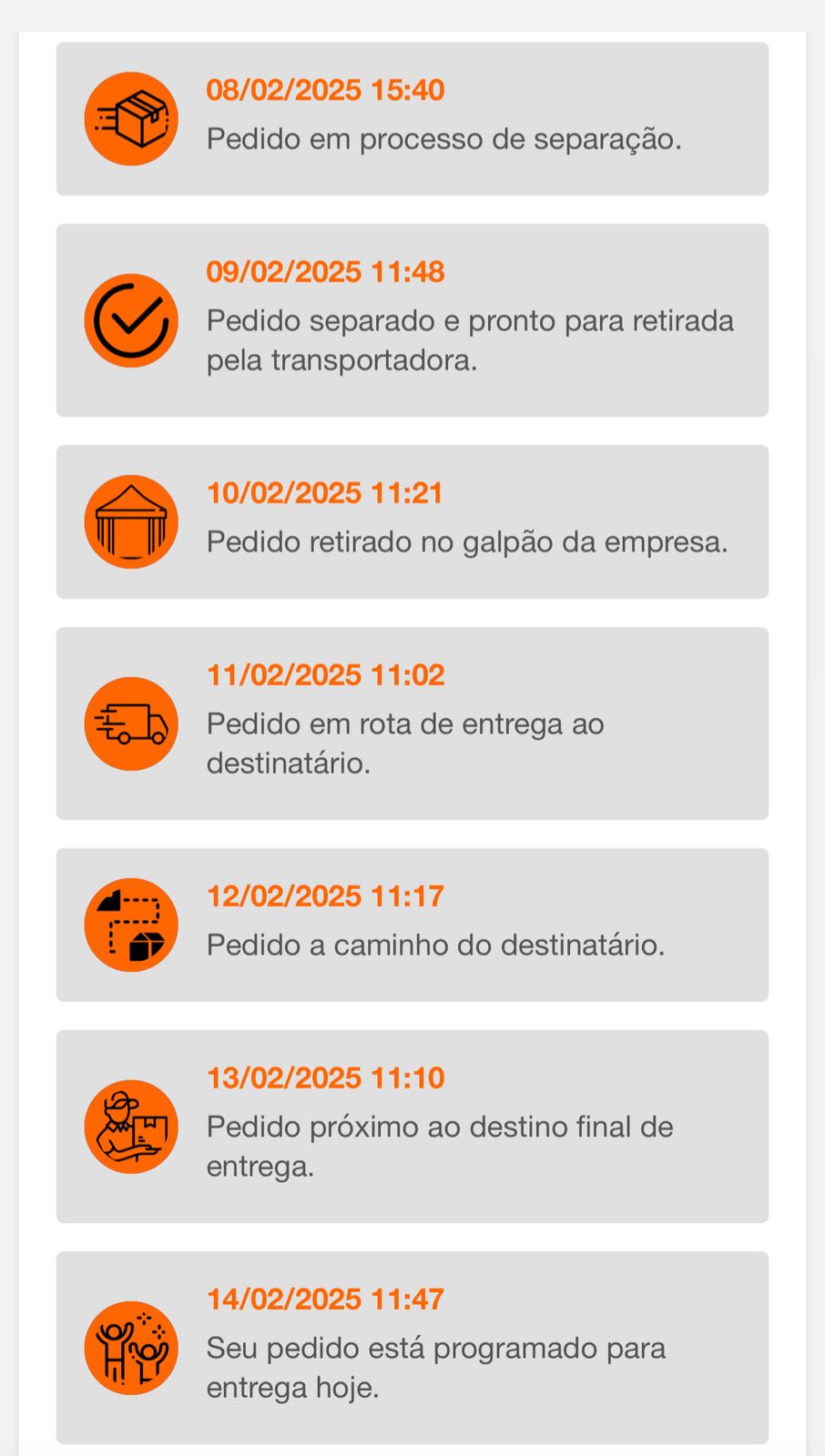 Ultima vez consegui acompanhar todo o meu pedido em tempo real, agregou muito valor na minha empresa